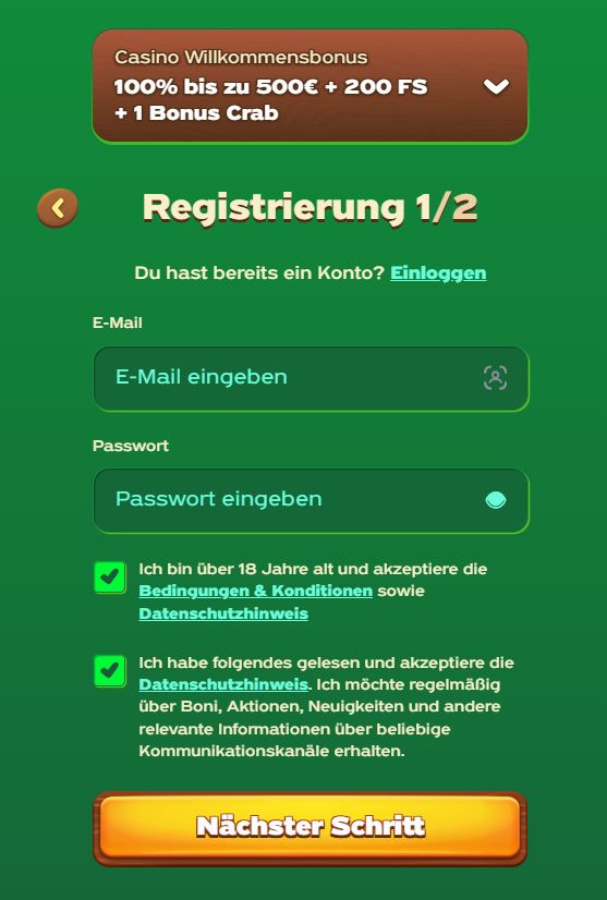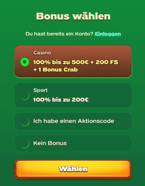 | Willkommensbonus | 100 % Bonus bis 500 € + 200 Freispiele + Bonus Crab |