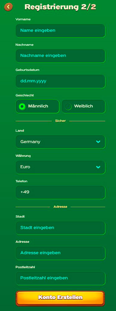 Schritt 4. Fügen Sie die restlichen Daten ein und klicken Sie auf “Konto erstellen”. Dann ist Ihre Registrierung vom Casino Greenluck erfolgt!